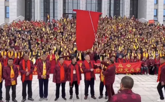 甲辰年举办世界蔡氏祭祖大典的世界蔡氏两总会湖北分会旗手,郑重地将族旗交给乙巳年举办世界蔡氏祭祖大典的世界蔡氏两总会福建分会旗手,交接双方高举族旗,全体蔡氏宗亲肃立行注目礼,并高呼祝贺世界蔡氏两总会福建分会荣获2025年度世界蔡氏清明祭祖大典的举办权。