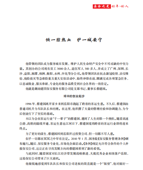 那时,保安行业在岳阳还是新鲜事物。蔡建国带着同事一家一家单位地跑,推销公司业务。凭着车队队长锻炼出来敢闯敢拼的精神,建囯保安成功打开局面。