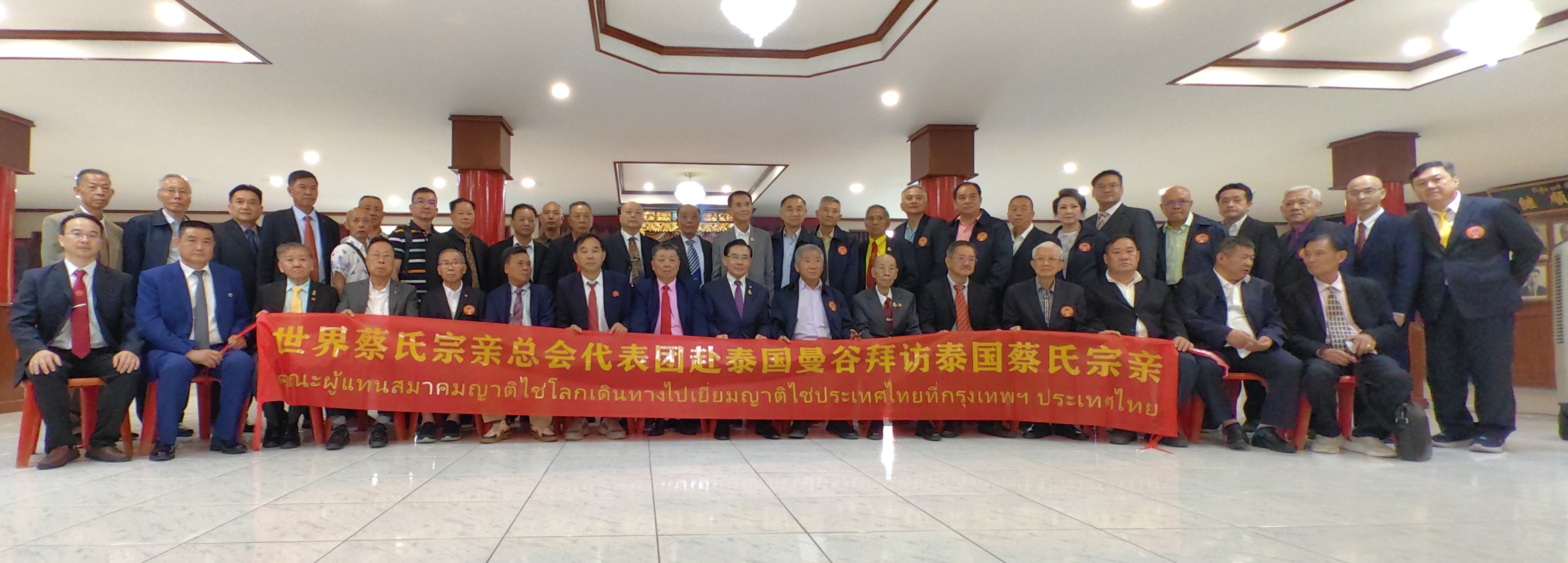 出席欢迎世蔡代表团的首长有:泰国蔡氏宗亲总会理事长蔡秋明,会长蔡衍孝,名誉会长蔡利昌,名誉会长兼资深参议蔡文忠,副会长兼资深参议蔡衍彬,资深副理事长蔡培鑫,资深副理事长蔡汉隆,资深副理事长兼对外蔡德钊,资深副理事长兼调解蔡蔚生,资深副理事长蔡启民,副理事长兼工商蔡暹坤,副理事长兼副财政及工商蔡裕民,副理事长兼财政蔡宏勋,副理事长蔡瑞光,副理事长蔡潮平,副理事长蔡文盛,副理事长蔡慧如,常务秘书蔡汉辉,常务交际蔡確源,吊务父际祭力金,埋事蔡茂生,理事兼福利蔡镇川,总干事纪任炎。