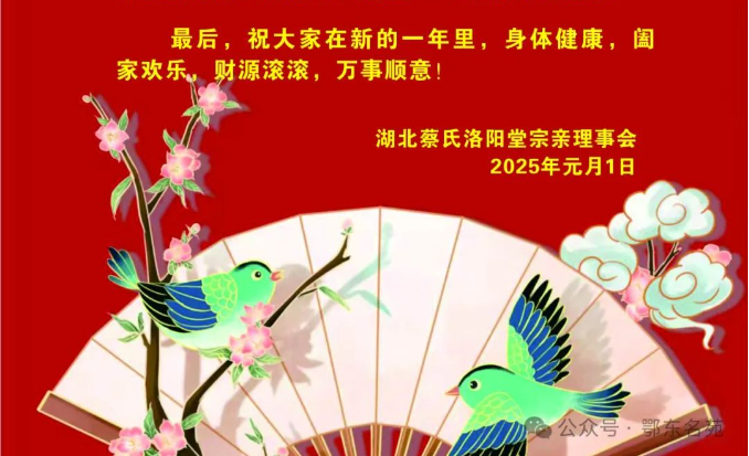 金龙腾跃岁稔年丰辞旧岁,青蛇漫舞明昭日绚照新明!满怀憧憬,盛盈喜悦,在2025’元旦辞旧迎新之际,湖北蔡氏洛阳堂宗亲理事会,向全体宗人致以新年的问候和诚挚的祝福!向一直以来关心支持我堂发展壮大的世界蔡氏两总会、省内各市县蔡氏宗亲会、省外各蔡氏宗亲会、社会各届人士和亲朋好友,表达由衷的感谢和崇高的敬意!