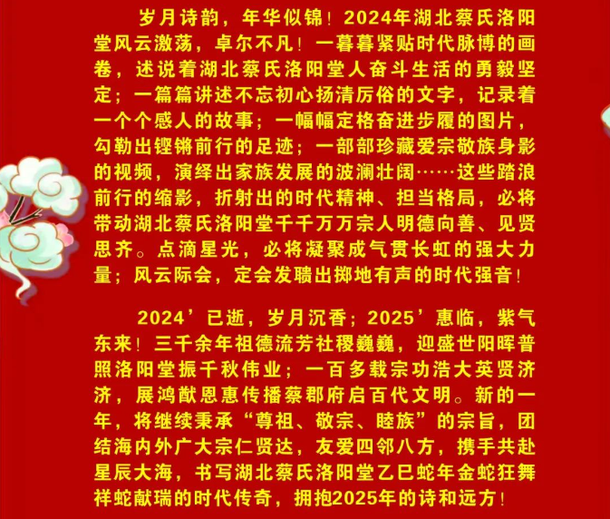 2024’已逝,岁月沉香;2025’惠临,紫气东来!三千余年祖德流芳社稷巍巍,迎盛世阳晖普照洛阳堂振千秋伟业;一百多载宗功浩大英贤济济,展鸿猷恩惠传播蔡郡府启百代文明。新的一年,将继续秉承“尊祖、敬宗、睦族”的宗旨,团结海内外广大宗仁贤达,友爱四邻八方,携手共赴星辰大海,书写湖北蔡氏洛阳堂乙巳蛇年金蛇狂舞祥蛇献瑞的时代传奇,拥抱2025年的诗和远方!