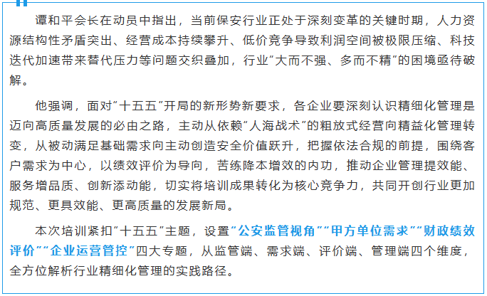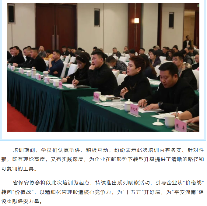 锚定开局之年,夯实发展根基。3月12日,“十五五”开局第一课——全省保安服务行业精细化管理培训班在长沙举行。省保安协会会长谭和平作开班动员、省保安协会领导赵剑出席,湖南省保安协会副会长、岳阳市政协委员、湖南建囯保安董事长蔡建国,各市州协会(联络处)、企业代表共280余人参加,共谋行业转型升级新路径。