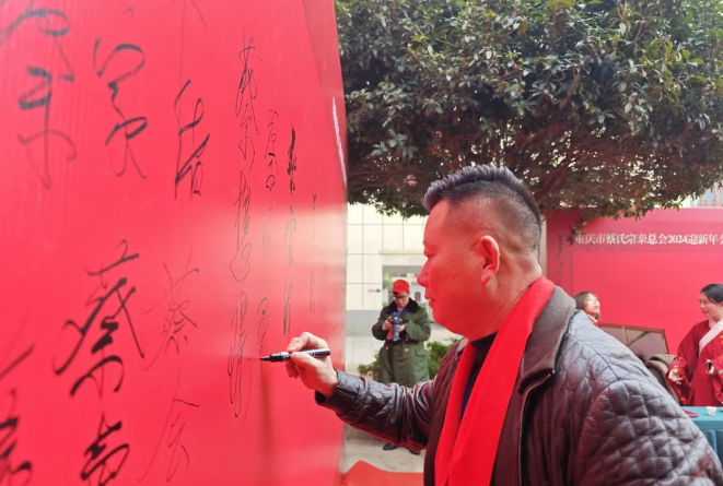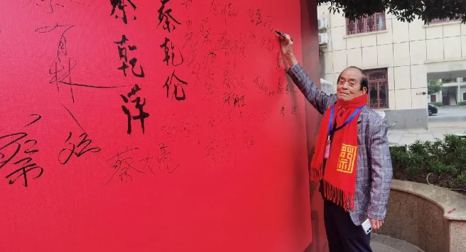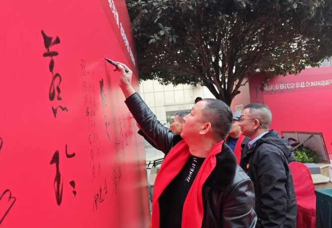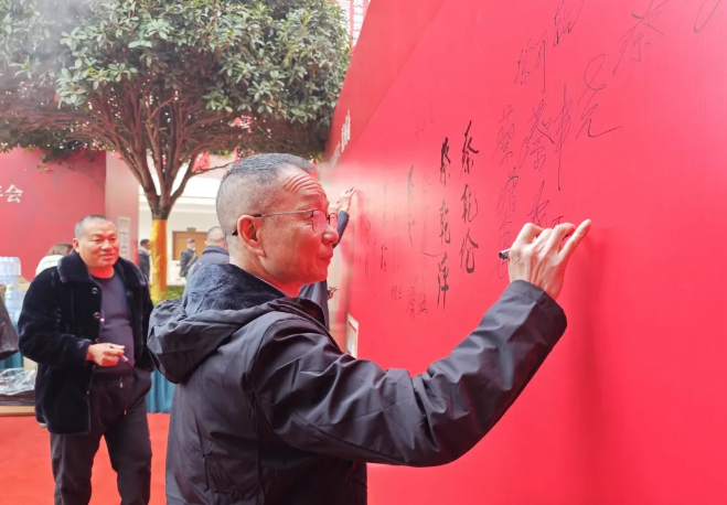 重庆市蔡⽒宗亲总会⽂化研究会蔡有林会⻓在签名墙上签名留念。