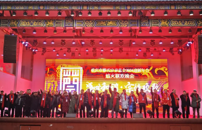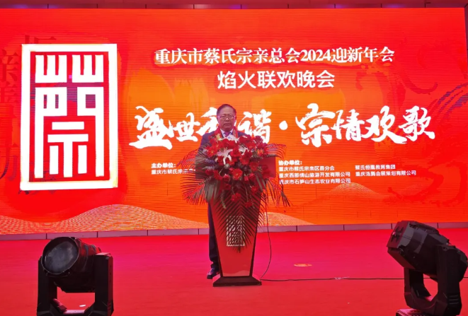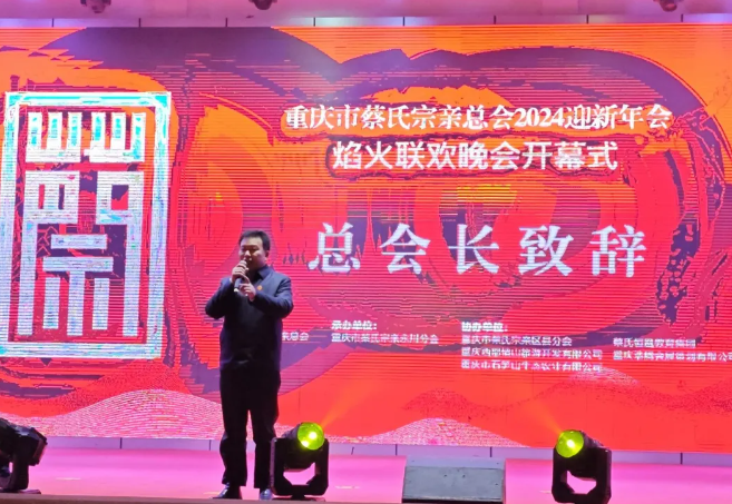12⽉29⽇晚上,重庆市蔡⽒宗亲总会为来⾃海内外的1000位蔡⽒家⼈准备了丰富的欢迎晚宴和文艺表演。重庆市蔡⽒宗亲总会执⾏会⻓蔡家泽先⽣致欢迎词。