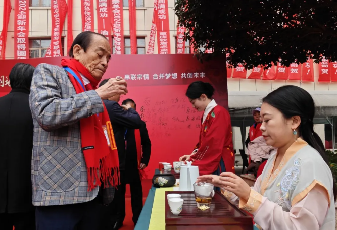 家泽会⻓与亲临现场参会的近九⼗⾼龄的⽼年宗⻓合影留念