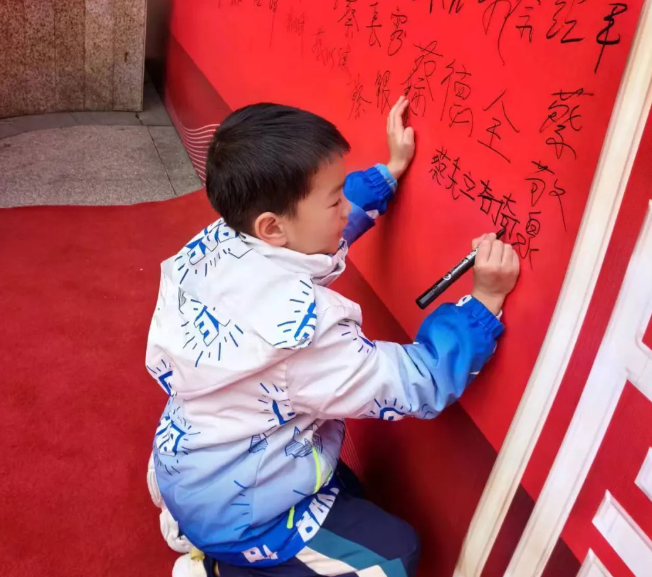 家⻛传承,家族兴盛,后辈⼦弟才是蔡⽒家族的未来和希望!⼩朋友在签名墙上认真签上⾃⼰的⼤名。