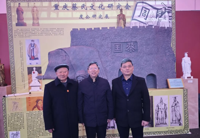 重庆市蔡⽒宗亲总会⽂化研究会的有林、⻓华、礼超宗⻓在浮 雕前合影