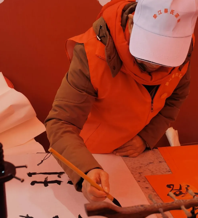 蔡⽒书法家们现场为家⼈们挥毫泼墨,创作书法作品及书写春联。求字的⼈⾥三层,外三层,场⾯异常⽕爆