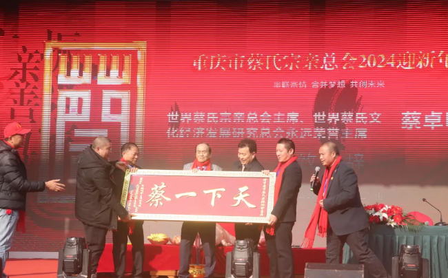 世界蔡⽒宗亲总会蔡卓明主席向重庆蔡⽒宗亲总会赠送“天下 ⼀蔡”红⽊匾额和赠送中华⼈⺠共和国前主席江泽⺠同志题写的书 法作品:蔡⽒始祖叔度公