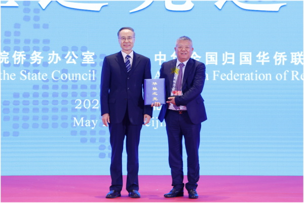 ▲中国侨联党组书记、主席万立骏向马达加斯加华商总会会长颁发“华社之光”荣誉证书