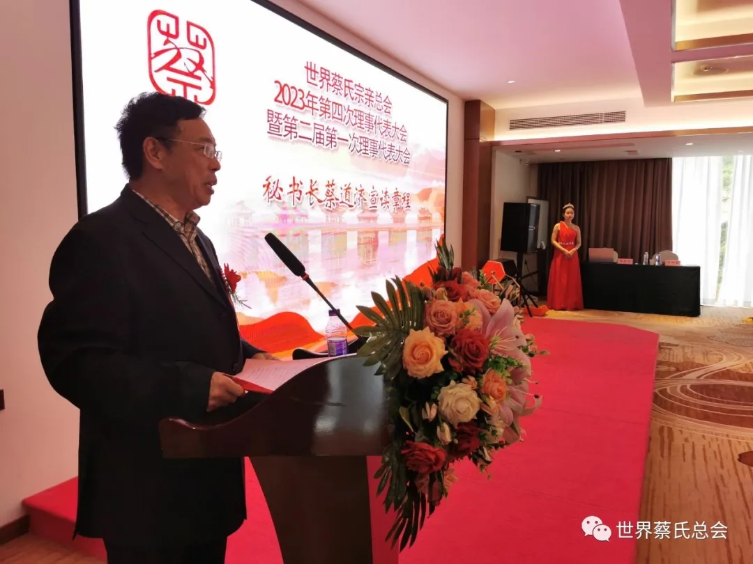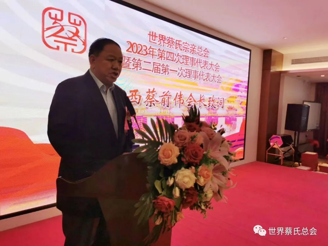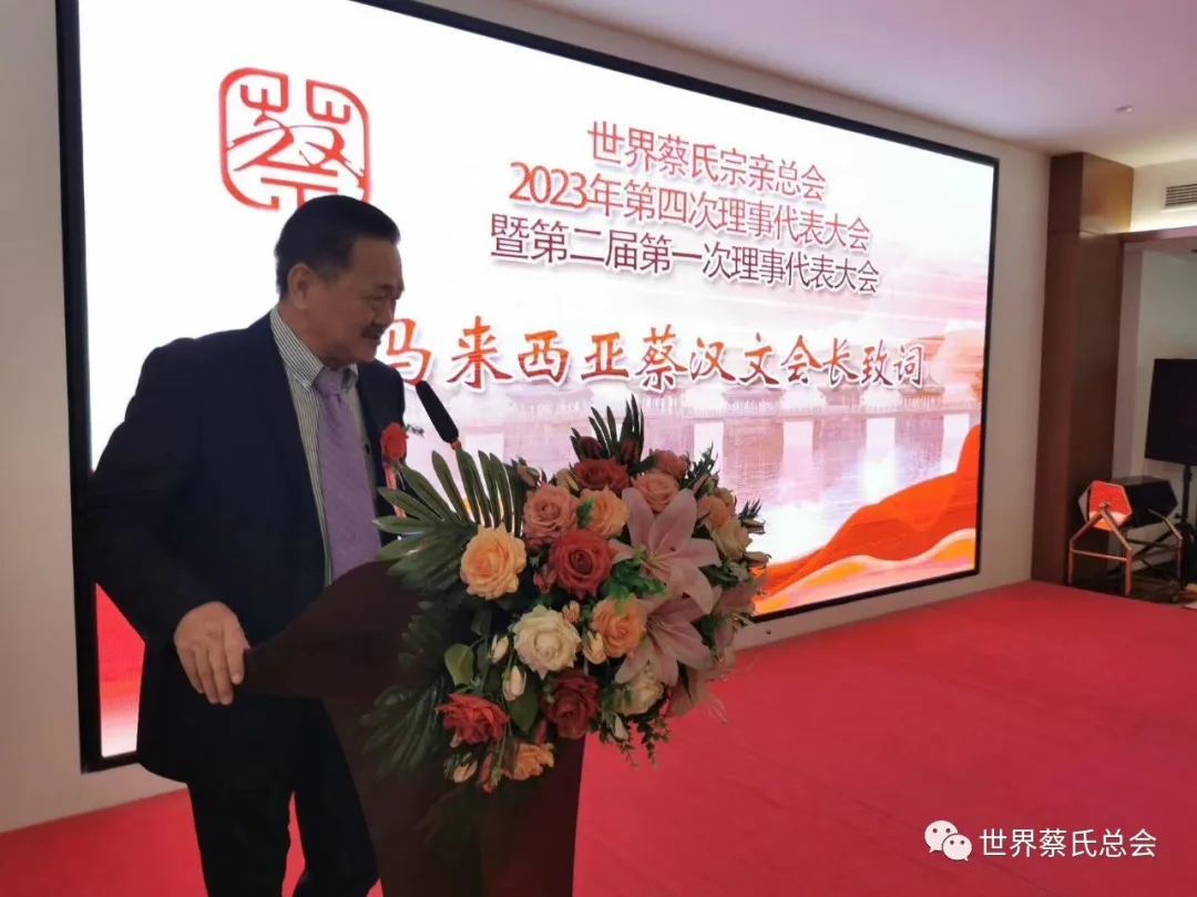 其后,新当选的世界蔡氏宗亲总会主席蔡松潮发表了致辞演讲:尊敬的蔡家作将军,尊敬的各位会长,蔡氏各位老前辈,各位宗亲,先生们女士们大家好!感谢大家对我的信任,选举我为总会主席,我将不负重望,努力把各项工作做好。