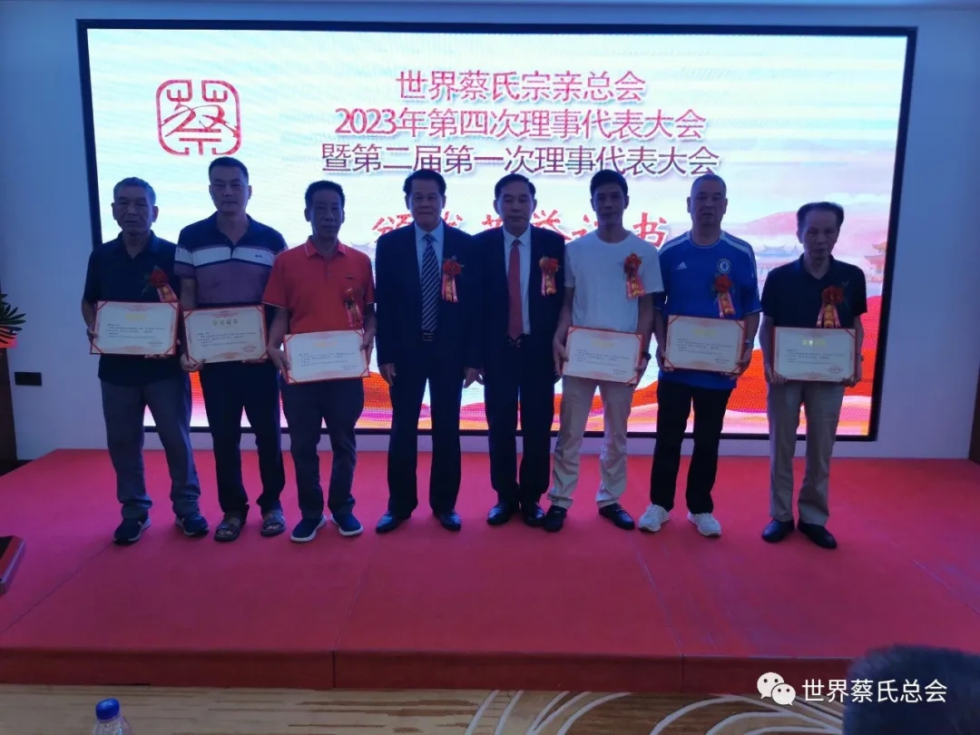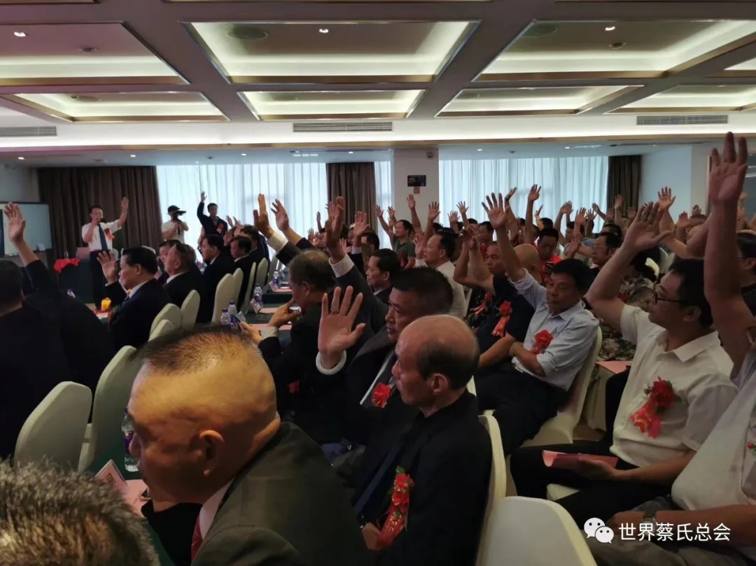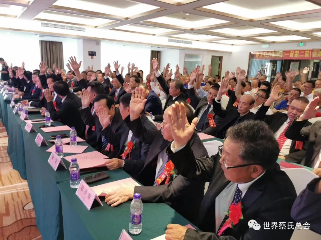 通过选举议程,主持人就理事、常务理事、副主席、主席候选人的主要业绩作了简要说明。依据《世界蔡氏宗亲总会章程》关于换届选举方式规定,与会代表们举手表决,推选蔡卓明、蔡延松、蔡家作、蔡崇伟、蔡多文、蔡素玉、蔡自兴、蔡第躼、蔡文献、蔡永廉、蔡奇蘭、蔡士力、蔡晖等 13 位宗长为世界蔡氏宗亲总会荣誉主席;选举广东蔡松潮为世界蔡氏宗亲总会主席,选举广东蔡进为世界蔡氏宗亲总会执行主席,选举湖南蔡木清为世界蔡氏宗亲总会监事长,选举福建蔡道济为世界蔡氏宗亲总会秘书长。