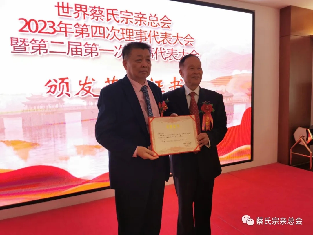 蔡松潮接过证书表示:2023年是疫情时代后的第一年,也是世界蔡氏宗亲总会发展新阶段的起步之年。三年疫情,让全球太多的蔡氏宗亲没能相聚交流,把酒言欢、共谋家族发展大计。现在随着疫情时代的结束,也将是全球各地蔡氏宗亲共叙宗族情谊、加强联谊交流,推动蔡氏文化研究,促进全球蔡氏大团结,共谋经济发展的新开始。在这个重新出发的重要年份,世界蔡氏宗亲总会将会在第二届理事成员们的共同努力下,更加完善总会相关制度,努力为蔡氏宗亲提供更加完善、广阔的交流平台,加强各地蔡氏宗亲的来往,在增乡情、亲情、友情的基础上,进一步增加全球蔡氏宗亲的凝聚力,为全球蔡氏大团结、为蔡氏家族的兴旺发展和进步贡献力量。