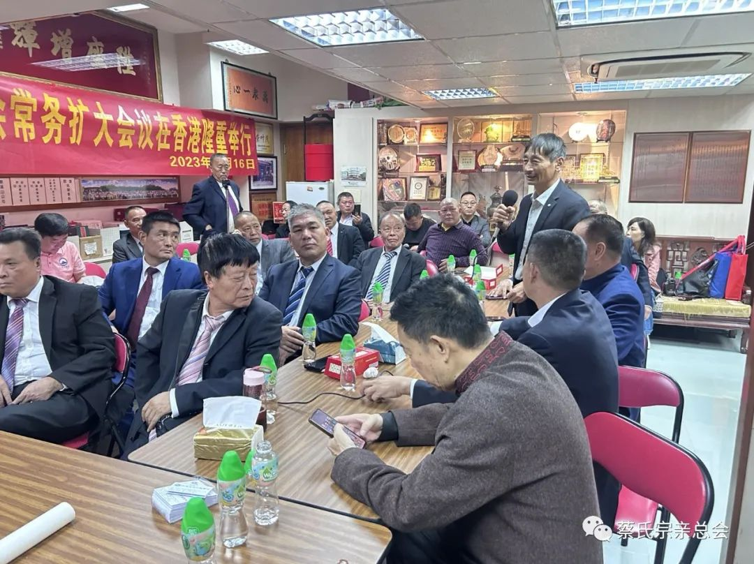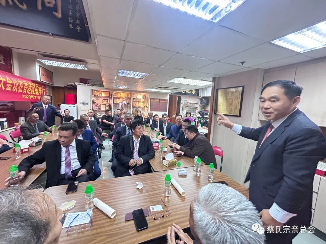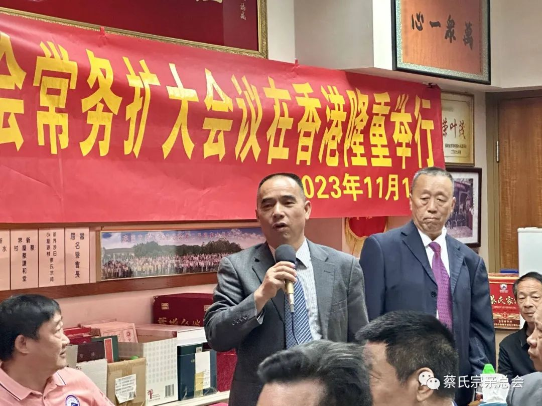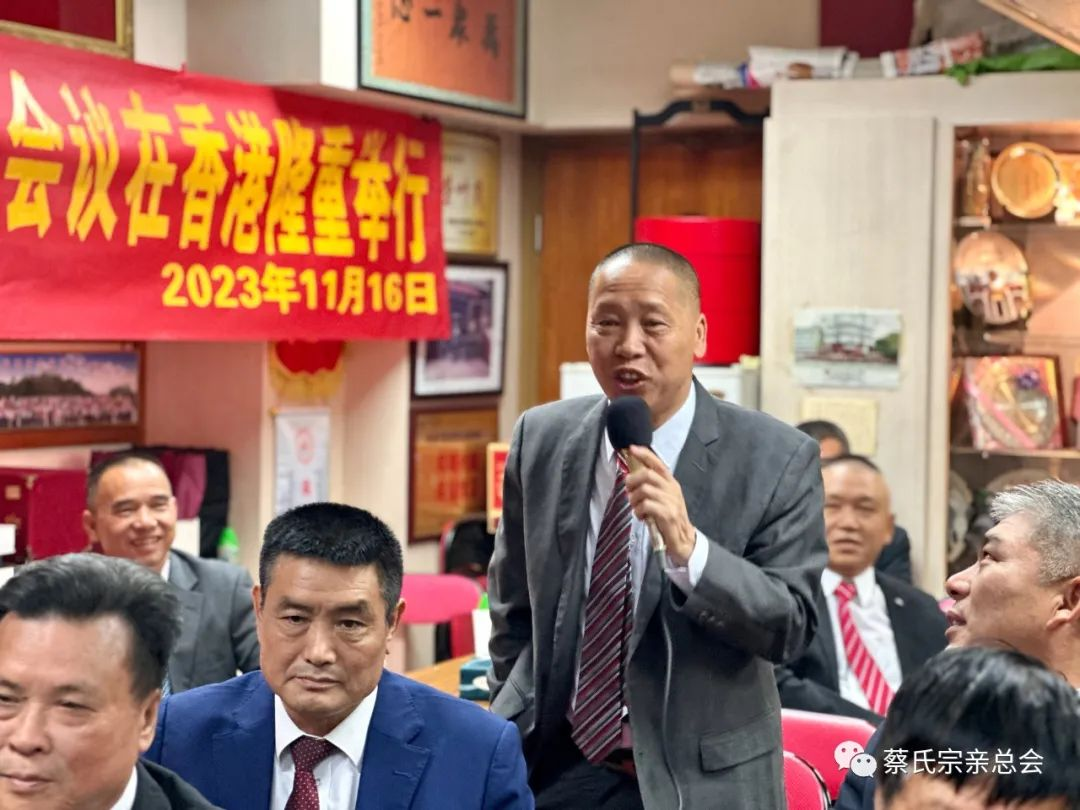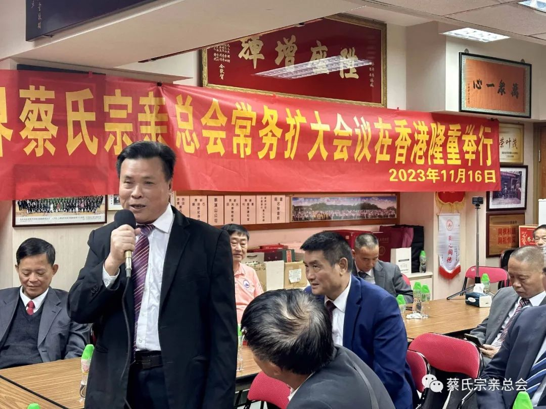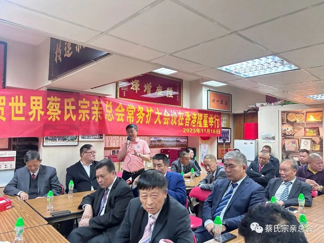 世界蔡氏宗亲总会主席蔡松潮致辞表示感谢香港蔡氏宗亲会对本次会议的支持,并就世界蔡氏宗亲总会的工作亮点作交流介绍,他说:“世界蔡氏宗亲总会第二届领导班子共同努力为蔡氏宗多做好事、做善事,实行扶贫济困、奖学助学、修宗祠、修祖墓、修族谱、出谋献策;以实际行动为总会签署向蔡氏子女考上清华大学、北京大学的优秀学子进行奖励,对蔡氏孤儿考上大学进行资助,对蔡氏婴儿兔唇救治实行医疗免费,这些事情都是我们大家重中之重的任务。特别是第二届领导宗亲班子集思广益、各尽所能、有钱出钱、有力出力,共同努力做了许多工作,真真正正为蔡氏家族做贡献。切实为弘扬蔡氏祖先传统美德,做到捧先祖、和天下,做出了自己的贡献。”