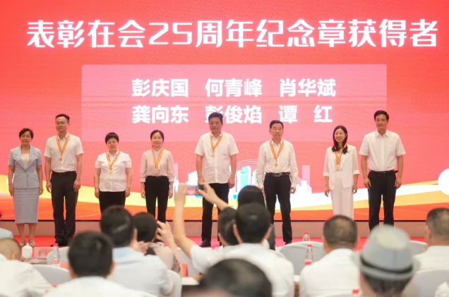 会上宣读了《关于为在工商联工作满25年的干部职工颁发荣誉证书的决定》,张中于、何祚云为肖华斌等6名“光荣在会25周年纪念奖章”获得者颁发纪念奖章和荣誉证书。