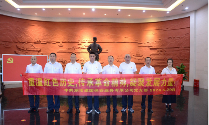 中共湖南建囯保安服务有限公司党支部,中共岳阳市建囯爱心义工协会党支部举行“七一”党日活动6月29日,湖南建囯保安服务有限公司董事长、党支部书记、岳阳市建囯爱心义工协会会长、党支部书记蔡建国组织全体党员开展了以“重温红色历史,传承革命精神,凝聚发展力量”为主题的“七一”党日活动。此次活动旨在加强党员队伍建设,提高党员的思想觉悟和党性修养,激励党员不忘初心、牢记使命,为公司的发展和社会的进步贡献力量。在何长工同志纪念馆,全体党员向何长工同志铜像敬献花篮、整理缎带,并在何长工同志铜像前庄严宣誓,党支部书记蔡建国带领新加入的共产党员和老党员集体庄严朗读入党誓词,坚定理想信念。并向2名在岗位上表现突出的优秀共产党员颁发了荣誉证书。在讲解员的引导下,馆内陈列的珍贵革命文物和感人至深的历史图片,生动地展现了何长工同志在建党、建军和建国伟大事业中作出的卓越贡献,以及他“为民众扛一辈子长工”的崇高品德和革命精神。党员们驻足观看,认真聆听,不时交流心得,深刻感受到革命先烈的伟大精神和崇高风范。随后,党员们前往周逸群烈士事迹陈列馆进行参观学习。在这里,大家深入了解了周逸群烈士的生平事迹,感受到了革命先烈在艰苦环境下展现出的英勇顽强、坚贞不屈的精神风貌。这次参观使党员们对党史有了更深刻的认识,对党性教育、思想教育和理想信念教育有了更直观的体验。活动结束后,党员们纷纷表示将把红色基因融入血脉,把革命精神转化为工作动力,以更加饱满的热情和更加务实的作风投入到公司的发展中。此次“七一”党日活动不仅是一次红色教育之旅,更是一次心灵的洗礼和精神的升华。