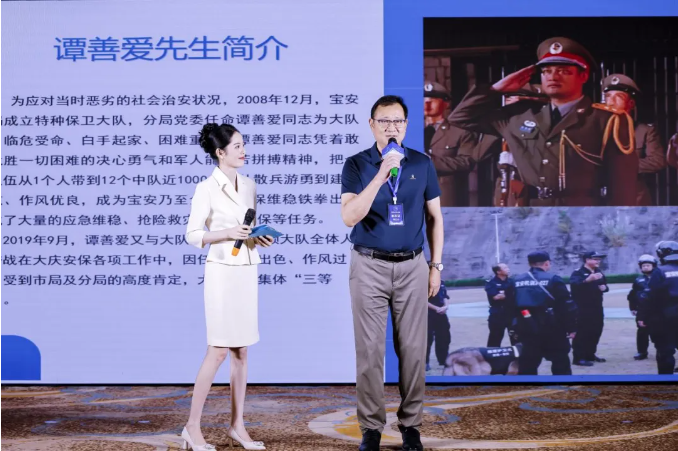 在颁证环节,主持人还现场采访了一位“特殊”的警官代表--深圳警队原二级高级警长(原宝安公安分局特保大队长)谭善爱,他还有一个引以为傲的身份,他曾是1997年香港回归中英防务交接的中国军方代表!他2005年12月转业,分配至深圳市公安局宝安分局,于2008年12月受命组建由近千名保安员组成的特种保安大队并担任大队长;他长期带领保安队伍在基层一线冲锋陷阵,完成诸多急难险重任务;他于去年荣退。当香港回归中英防务交接现场视频及谭善爱军人形象出现在屏幕时,全场响起雷鸣般掌声!谭警官深情讲述了当年的场景,他自豪,作为军人理应为国奉献;他自豪,为保安工作也付出了心血和汗水。