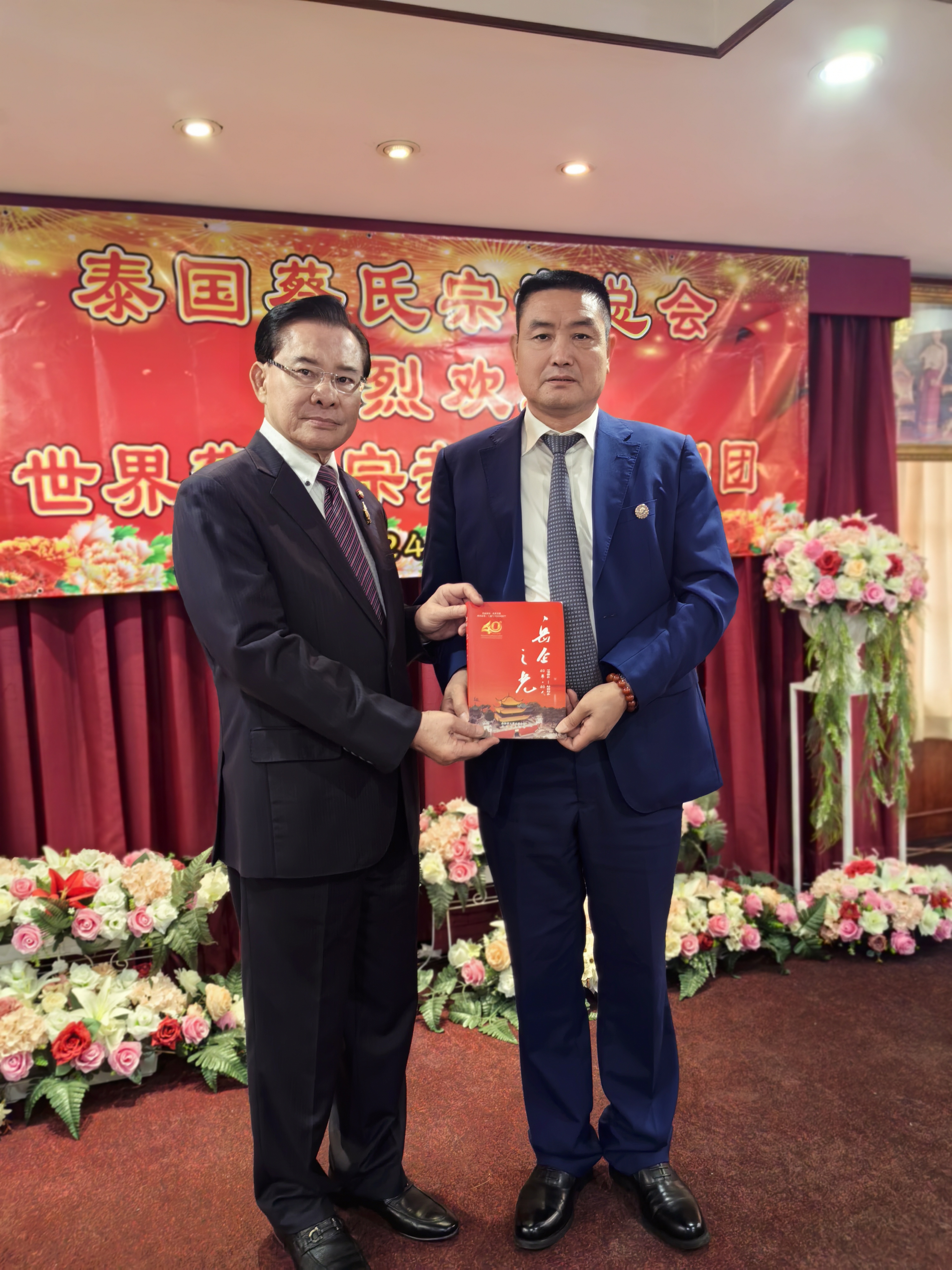 在年会上,世界蔡氏宗亲总会常务副主席、湖南建囯保安董事长蔡建国作了发言,并向泰国蔡氏宗亲总会理事长(泰国曼谷市副市长)蔡秋明赠送"岳企之光”岳阳市工商联成立四十年四十人书籍!