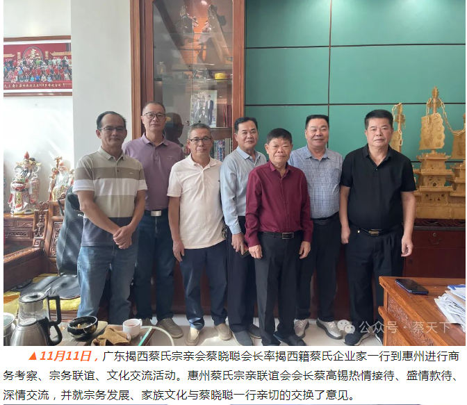 ▲11月2日,广东惠州蔡氏宗亲联谊会开展走访调研宗亲企业活动,在会长蔡高锡的带领下,一行10人到本会副会长蔡飞企业——蔚然天成有限公司,开展访问、联谊,体验该公司经营的“景陶”陶瓷厨具和餐具健康品牌,并与公司负责人蔡飞进行了座谈交流。