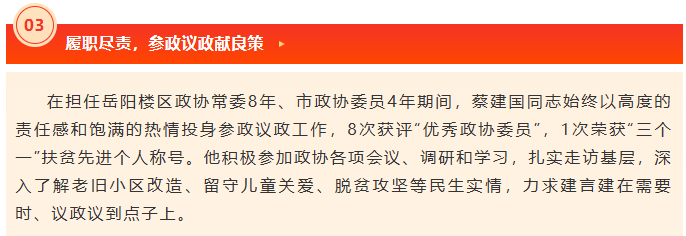 自担任政协委员12年来,他累计撰写提案32篇,9次获评“优秀政协委员”。其带领的企业先后荣获湖南省党建“示范单位”、湖南省学雷锋志愿服务“百强社团”、“万企帮万村”爱心企业、岳阳市“先进基层党组织”、非公党委“五级先进党组织”等称号,并被公安部表彰为“全国抗疫先进保安集体”。