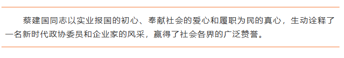 多年来,蔡建国同志始终牢记初心使命,团结带领企业员工积极投身社会公益,勇担社会责任。
