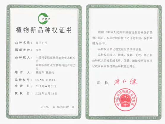 经国家农业部植物新品种测试中心DNA指纹检测,和华智水稻生物技术有限公司56K水稻SNP基因芯片指纹图谱检测,确认巨型稻是一种水稻新种子材料,并已获得农业农村部植物新品种权证书(下图)。
