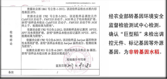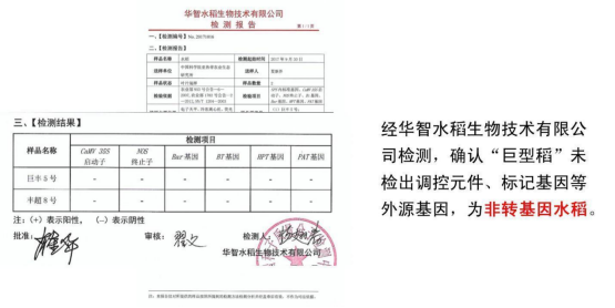 农业部转基因植物环境安全监督检验测试中心及华智水稻生物技术有限公司检测分析均表明:巨型稻为非转基因水稻。