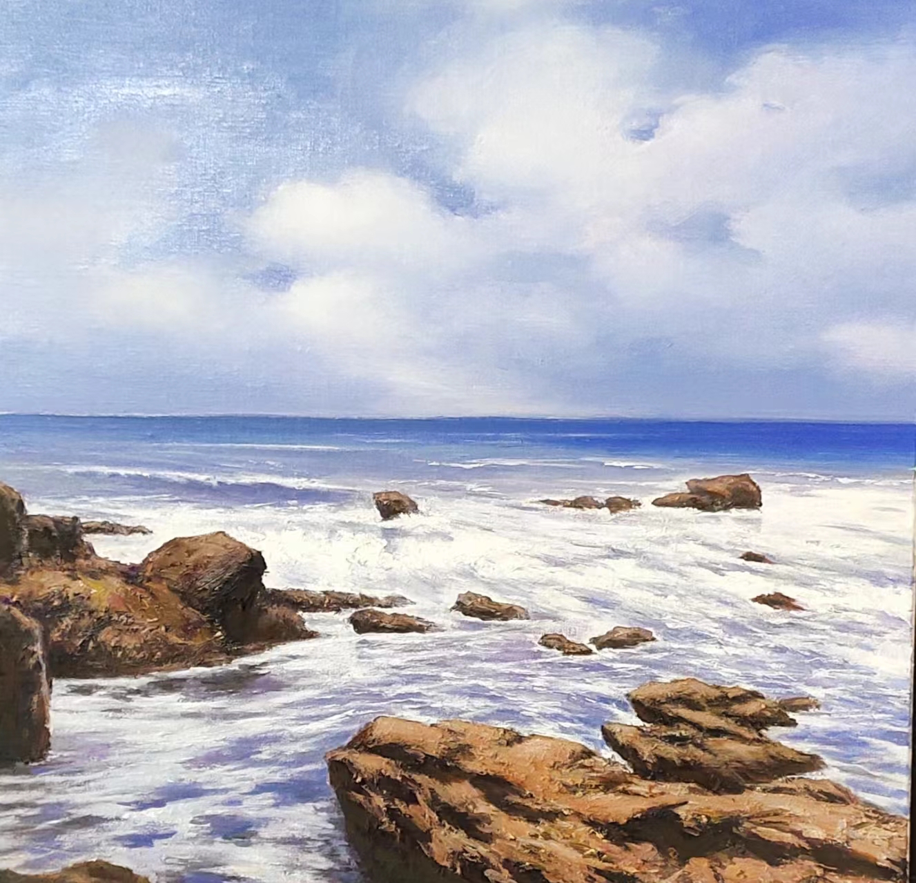 鸥鹭翔鸣涛声响,潋滟波光晃荡。